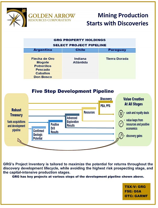Golden Arrow’s property portfolio has been developed over the past 26 years and constitutes an aggressive and exceptional pipeline with the potential to generate shareholder value.The portfolio currently includes multiple projects with discovery potential including our newly acquired properties in Chile and Paraguay.