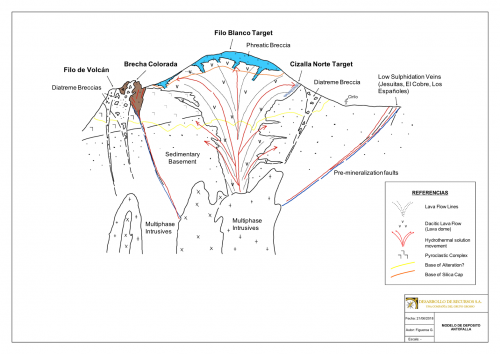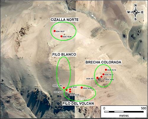 - Filo del Volcan. This target includes diatreme breccias intruding dacitic pyroclastic flows. The three drill holes completed on this target (DDA-01, DDA-04 and DDA-08) encountered several high-grade intervals including 2 m @ 145 g/t Ag. This target is linked with the Colorada Breccia by the ENE-WSW fractures which may have controlled the emplacement of these bodies. Hole DDA-09 was drilled in-between the targets and intercepted several hydrothermal breccias with grey silica and pyrite. Silver values were generally low in this hole but anomalous gold intervals (i.e. 14 m@ 0.16 g/t Au), similar to the Colorada Breccia target, were encountered.
