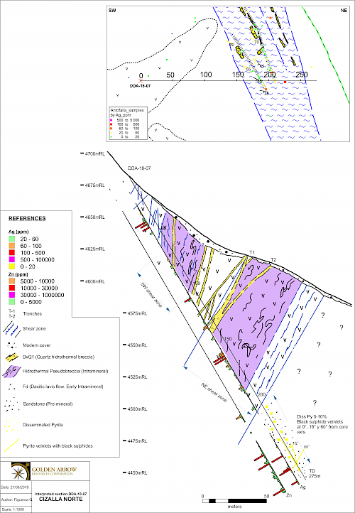 - Cizalla Norte (previously Domos Norte). This target is in the north part of the Dome Zone. It includes a composite shear belt of approximately 650 m long with an azimuth of 110° and dipping 50-60° to the SW in dacitic lava flows. This belt consists of two parallel shear zones, each of 35 to 40 metres width, situated 30 metres apart. Silver mineralization appears to be related to hydrothermal breccias and quartz veinlets within the shear zones. Channel sampling of surface trenches cut the Northeast shear zone obliquely, and returned an average of 61.8 m @ 62 g/t Ag (41 samples averaging 1.5 m wide; 6 samples returned > 100 g/t Ag). Holes DDA-05 and DDA-07 are parallel holes drilled into this target, 110 m apart. Both holes intercepted both shear zones. The Southwest shear zone was first detected by these holes because at surface it is covered by alluvium material. Hole DDA-05 encountered isolated intervals of mineralization with up to 2 m @ 116 g/t Ag. Hole DDA-07, 110 m northwest of hole DDA-05, was drilled across the contact through the underlying Permian sandstones. In the shear zone cut by hole DDA-07 there are silicified breccias with up to 3 m @ 191 g/t Ag. At the contact with, and for 70 metres into, the Permian sandstones, from 205 to 275 metres deep, drilling intercepted a sphalerite/galena stockwork zone containing higher silver-zinc values, including 1m @ 283 g/t Ag and 2.1% Zn, 3 m @ 131 g/t Ag and 1 m @ 110 g/t Ag, 1.7% Pb and 4.1% Zn. A cross-section including hole DDA-07 is shown in Figure 3. The presence of the shear belt close to the contact of the underlying Permian sandstones is a new target just partially tested with these holes. Of particular note is that hole DDA-07 ended in mineralization at 275 m depth. Both ends of the shear belt and to depth are open and require testing with additional drill holes.