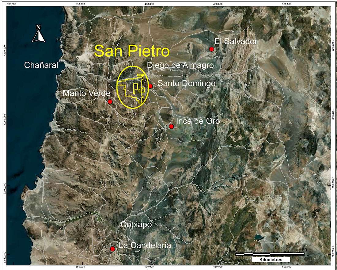 The San Pietro Project includes 18,448 hectares of exploration and exploitation concessions in the Atacama region of Chile, approximately 100 kilometres north of Copiapo in an active mining district that is home to all the major IOCG deposits in Chile. There is excellent mining infrastructure in the area, and the property is situated immediately adjacent to the west of Capstone Mining’s Santo Domingo mine development project and 10 km northeast of Mantos Copper’s Mantos Verde mine (see Figure 1). Capstone Mining Corp. and Mantos Copper Bermuda Limited are currently completing a business combination. Proximity to other mining projects in the area does not provide any assurances with respect to the prospects at the San Pietro Project.