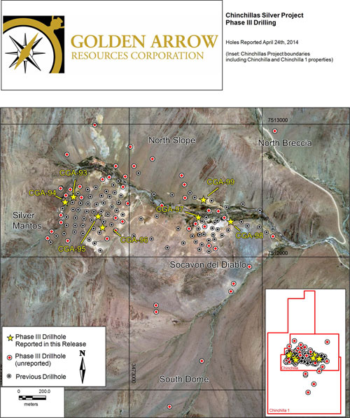 Vancouver, BC / TNW-Accesswire / Apr 24 2014 / Golden Arrow Resources Corporation (TSX-V: GRG, FRA: GAC (WKN: A0B6XQ), "Golden Arrow" or the "Company") is pleased to announce results from the first seven holes of the 6000 metre Phase III drill program at the Chinchillas Silver Project in Jujuy province, Argentina.